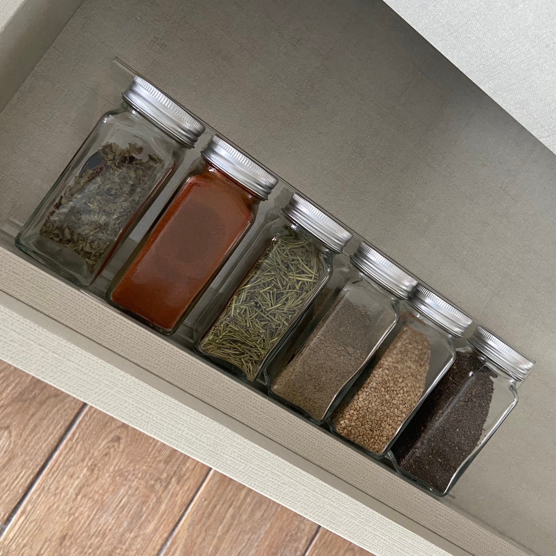 Set de 6 especieros de vidrio, con base para colocarlos en gaveta de material acrílico